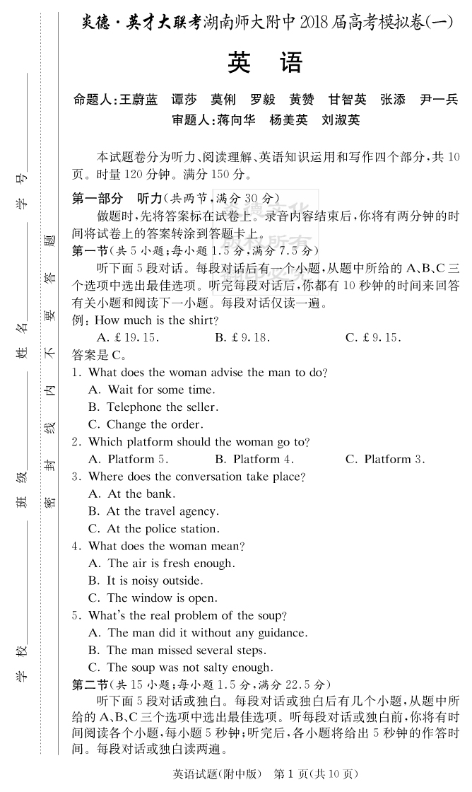 【英語】炎德英才大聯(lián)考2018師大附中高三8次月考(模擬一)