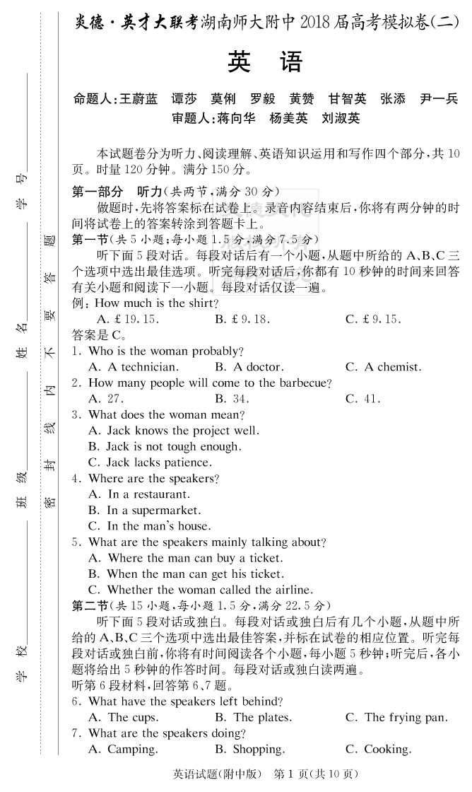 【英語】炎德英才大聯(lián)考2018師大附中高三9次月考(模擬二)