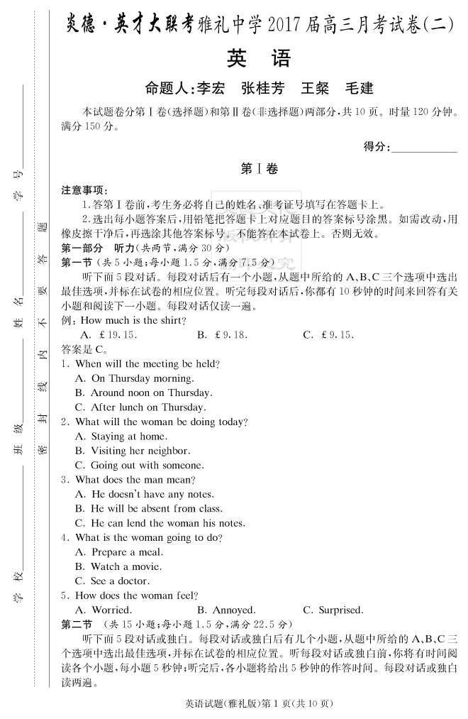 【英語】炎德英才大聯(lián)考2017雅禮中學(xué)高三2次月考