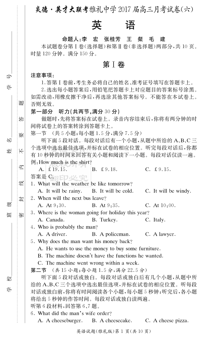 【英語(yǔ)】炎德英才大聯(lián)考2017雅禮中學(xué)高三6次月考