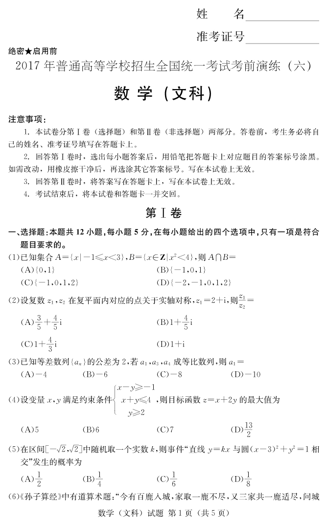 【文數(shù)】2017年普通高等學(xué)校招生全國(guó)統(tǒng)一考試考前演練(六)