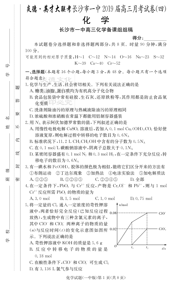 【化學(xué)】炎德英才大聯(lián)考2019長(zhǎng)沙一中高三4次月考