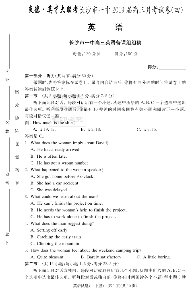 【英語】炎德英才大聯(lián)考2019長沙一中高三4次月考