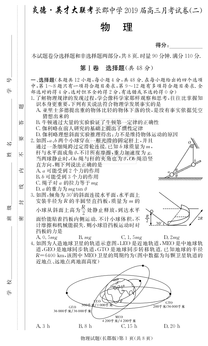 【物理】炎德英才大聯(lián)考2019長郡中學高三2次月考