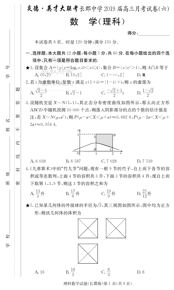 【理數(shù)】炎德英才大聯(lián)考2019長郡中學(xué)高三6次月考