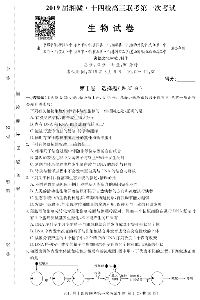 【生物】炎德英才大聯(lián)考2019長郡中學(xué)高三7次月考(十四校聯(lián)考一)