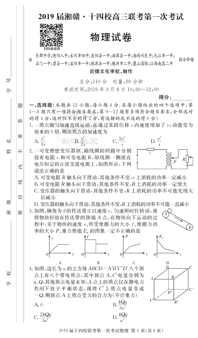 【物理】炎德英才大聯(lián)考2019長郡中學高三7次月考(十四校聯(lián)考一)