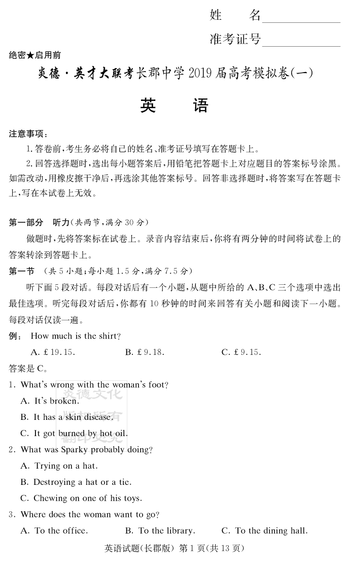 【英語】炎德英才大聯(lián)考2019長郡中學(xué)高三9次月考(模擬一)