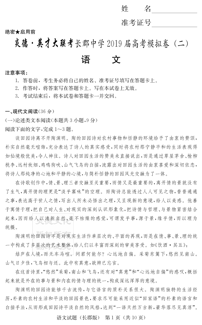 【語文】炎德英才大聯(lián)考2019長(zhǎng)郡中學(xué)高三10次月考(模擬二)