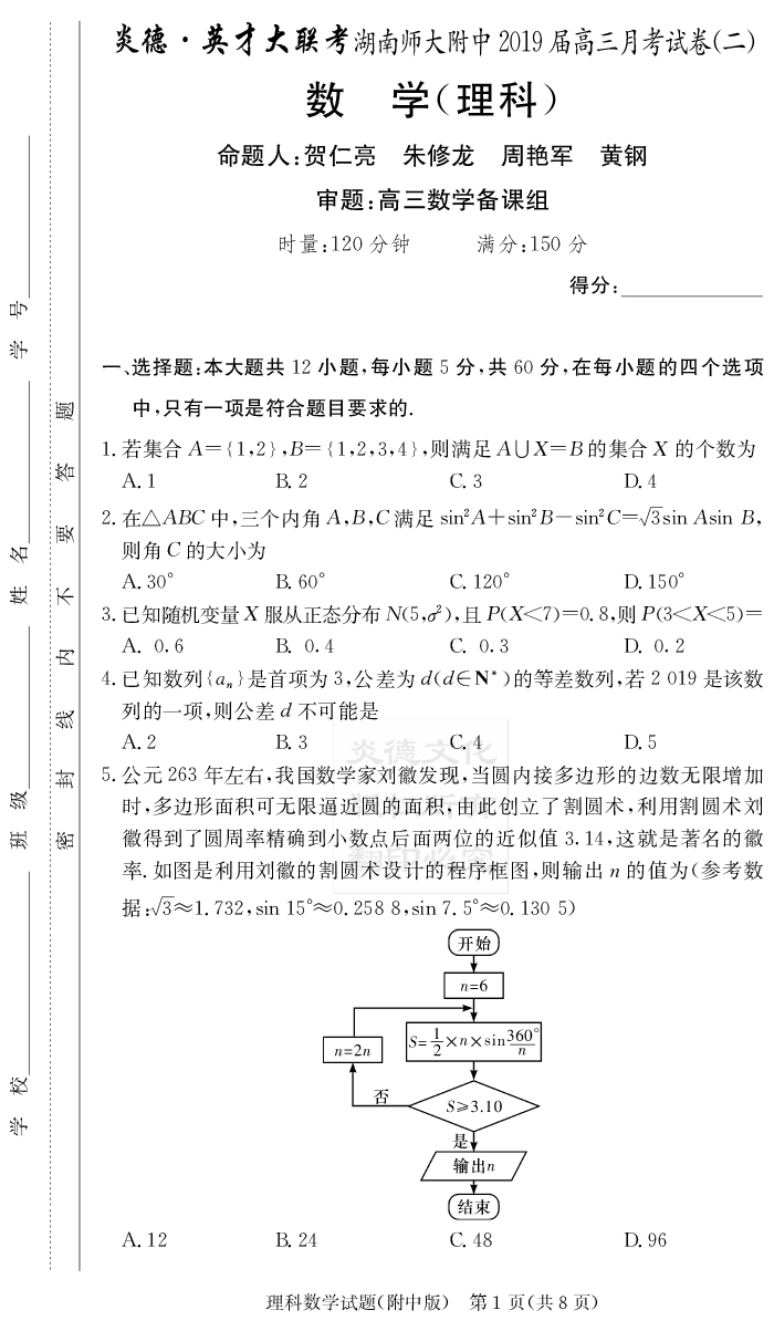 【理數(shù)】炎德英才大聯(lián)考2019師大附中高三2次月考