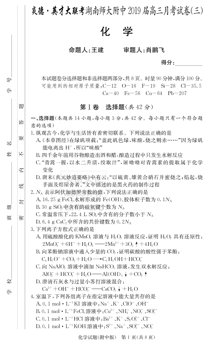 【化學(xué)】炎德英才大聯(lián)考2019師大附中高三3次月考