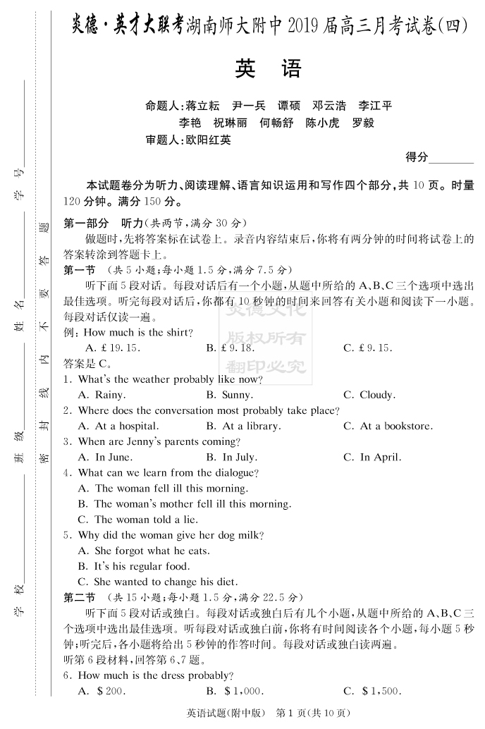 【英語(yǔ)】炎德英才大聯(lián)考2019師大附中高三4次月考