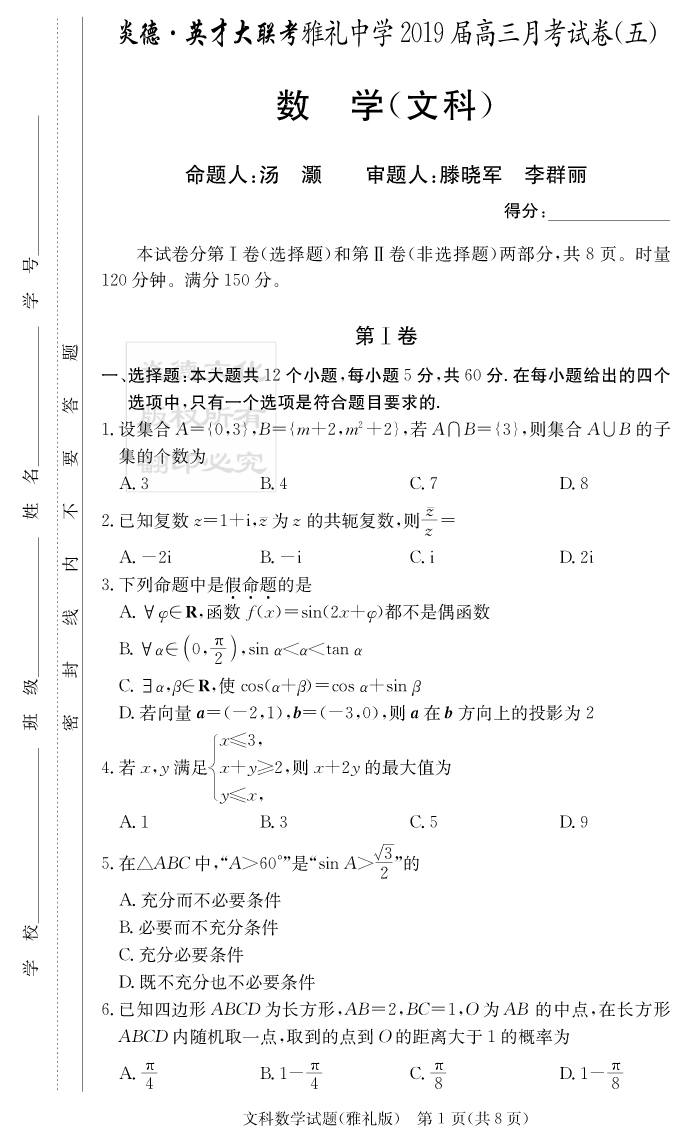 【文數(shù)】炎德英才大聯(lián)考2019雅禮中學(xué)高三5次月考