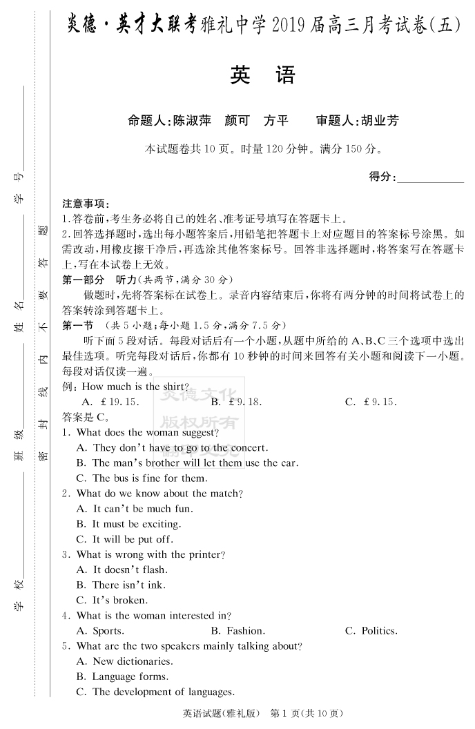 【英語】炎德英才大聯(lián)考2019雅禮中學(xué)高三5次月考