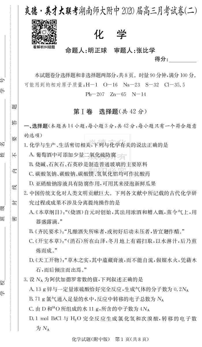 【化學(xué)】炎德英才大聯(lián)考2020屆師大附中高三2次月考