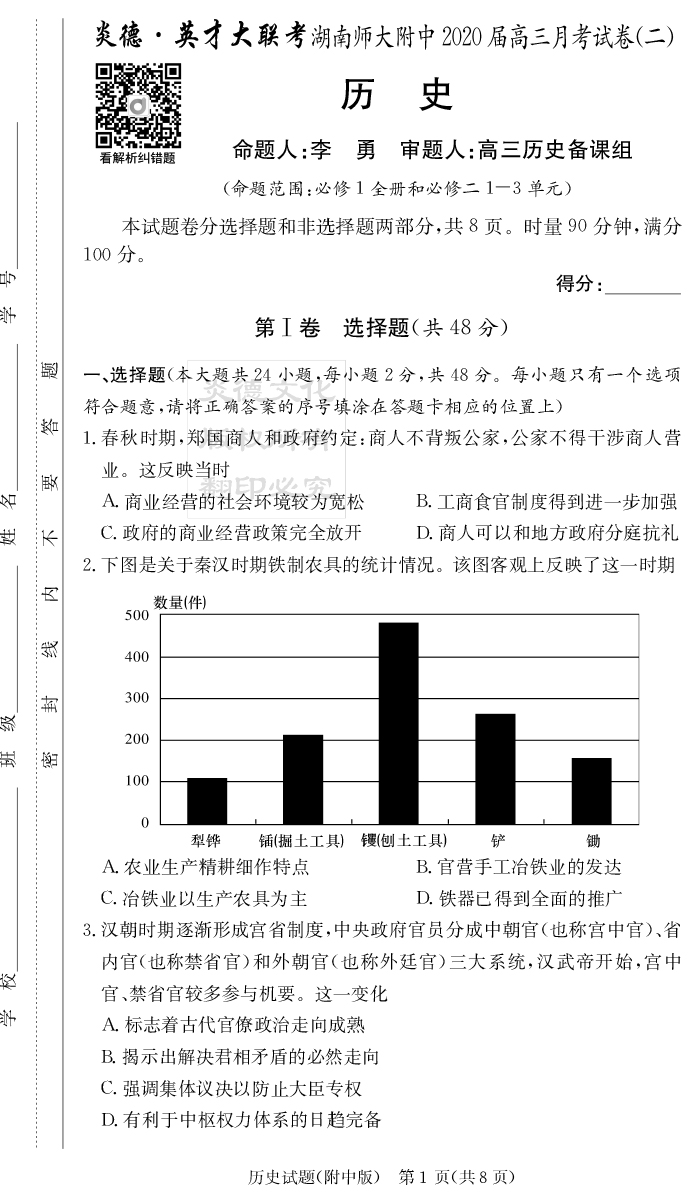 【歷史】炎德英才大聯(lián)考2020屆師大附中高三2次月考