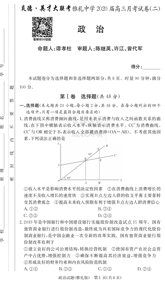 【政治】炎德英才大聯(lián)考2020屆雅禮中學(xué)高三2次月考