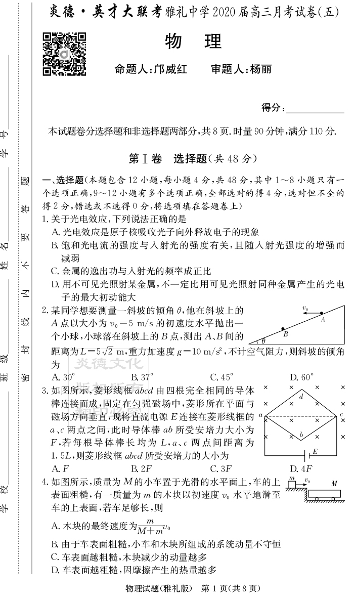 【物理】炎德英才大聯(lián)考2020屆雅禮中學(xué)高三5次月考