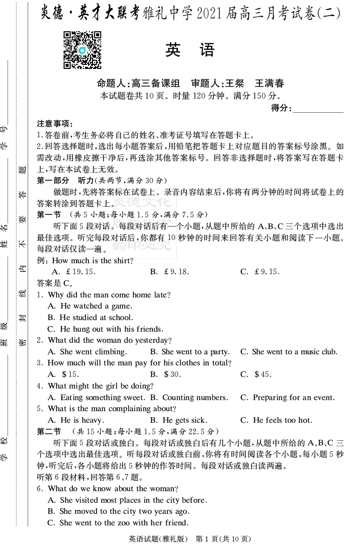 【英語】炎德英才大聯(lián)考2021屆雅禮中學(xué)高三2次月考