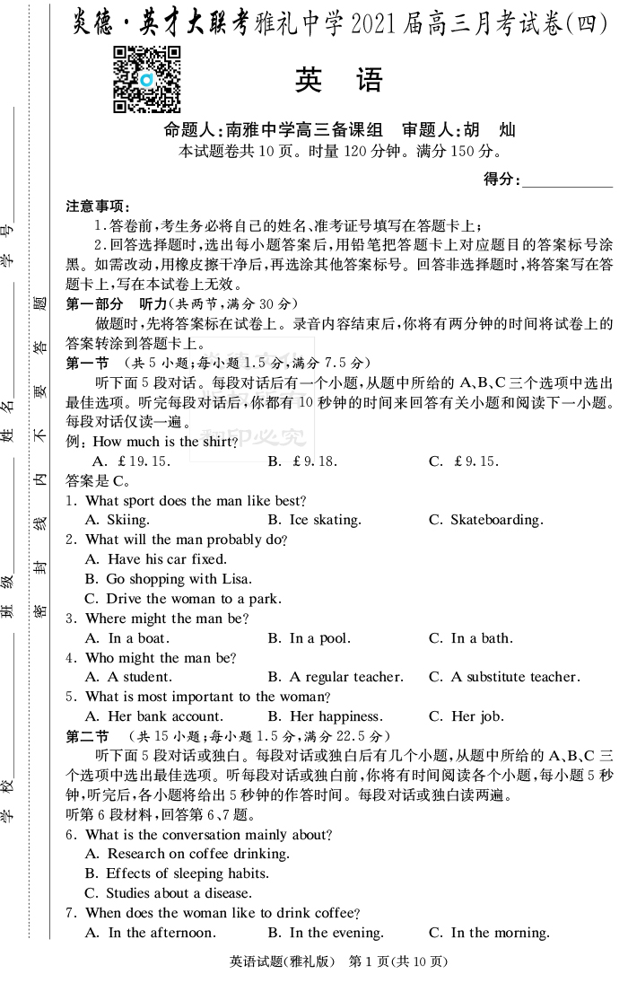 【英語(yǔ)】炎德英才大聯(lián)考2021屆雅禮中學(xué)高三4次月考