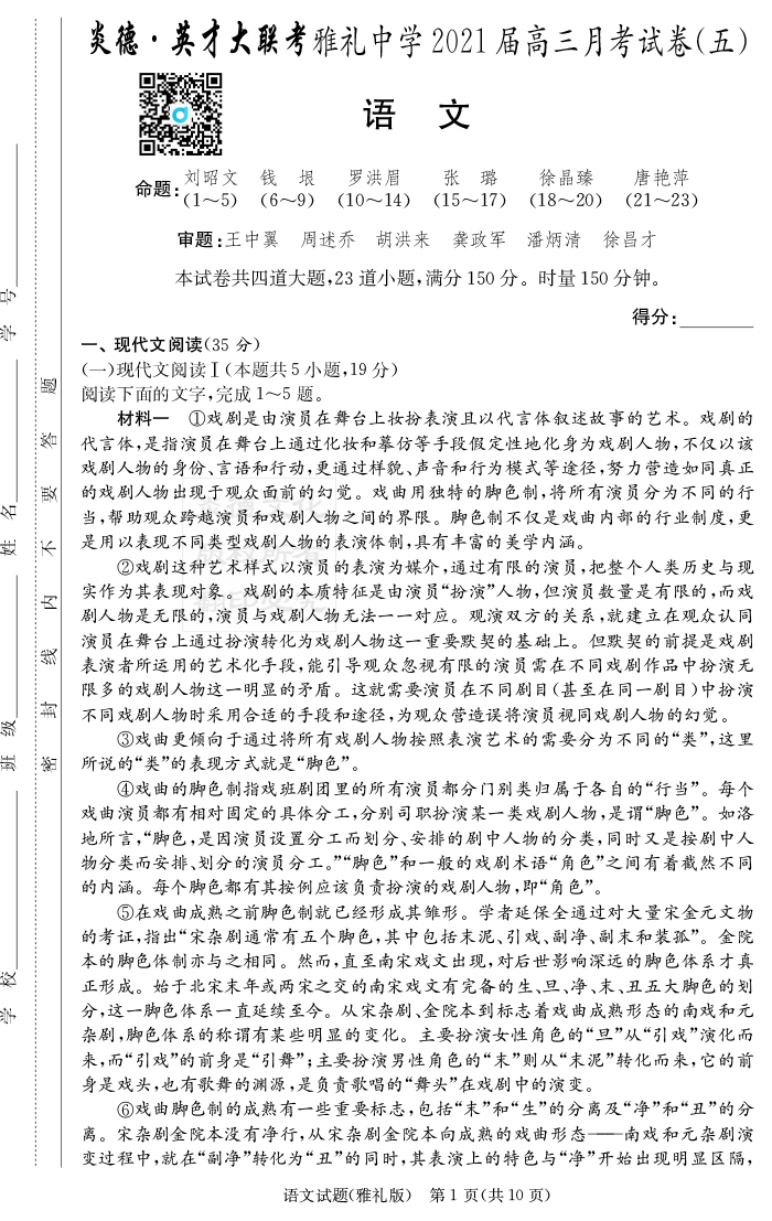 【語(yǔ)文】炎德英才大聯(lián)考2021屆雅禮中學(xué)高三5次月考
