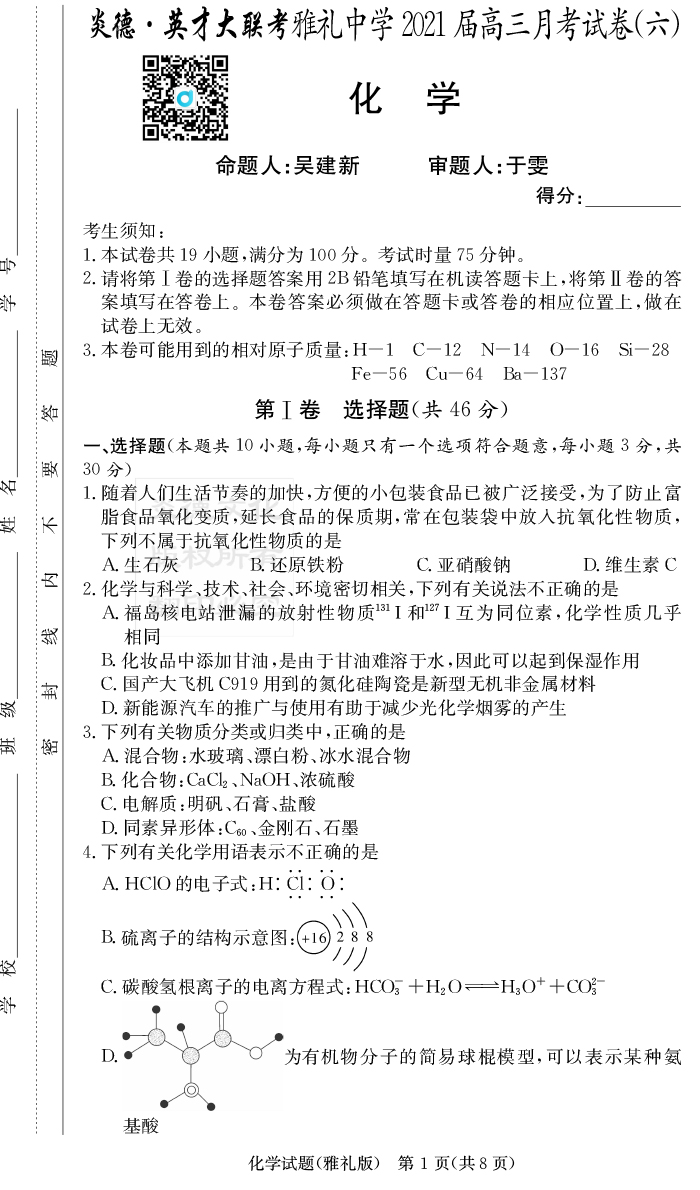 【化學(xué)】炎德英才大聯(lián)考2021屆雅禮中學(xué)高三6次月考