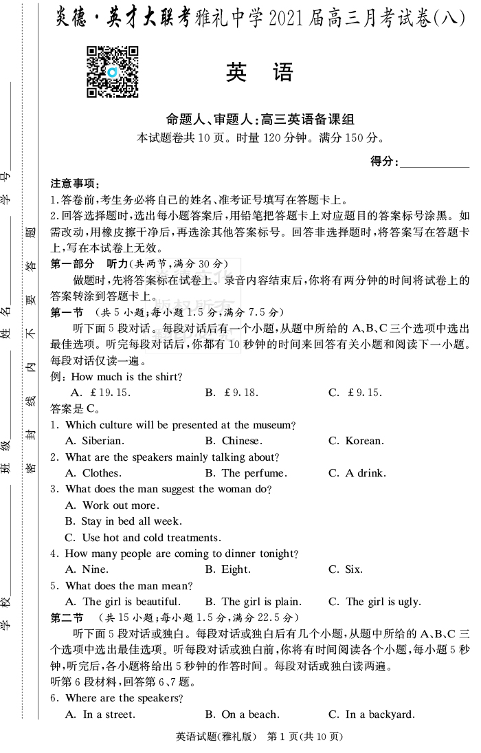 【英語】炎德英才大聯(lián)考2021屆雅禮中學(xué)高三8次月考