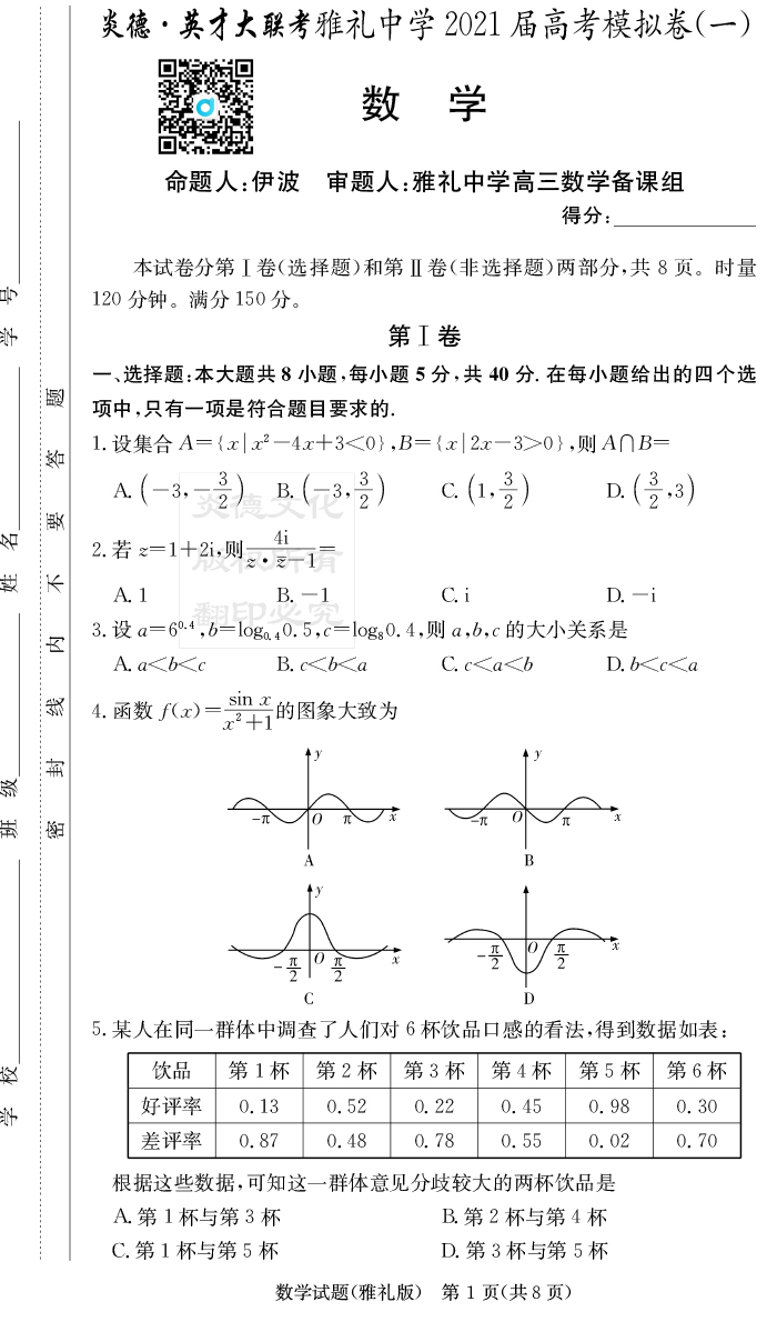 【數(shù)學(xué)】炎德英才大聯(lián)考2021屆雅禮中學(xué)高三9次月考(模擬一)