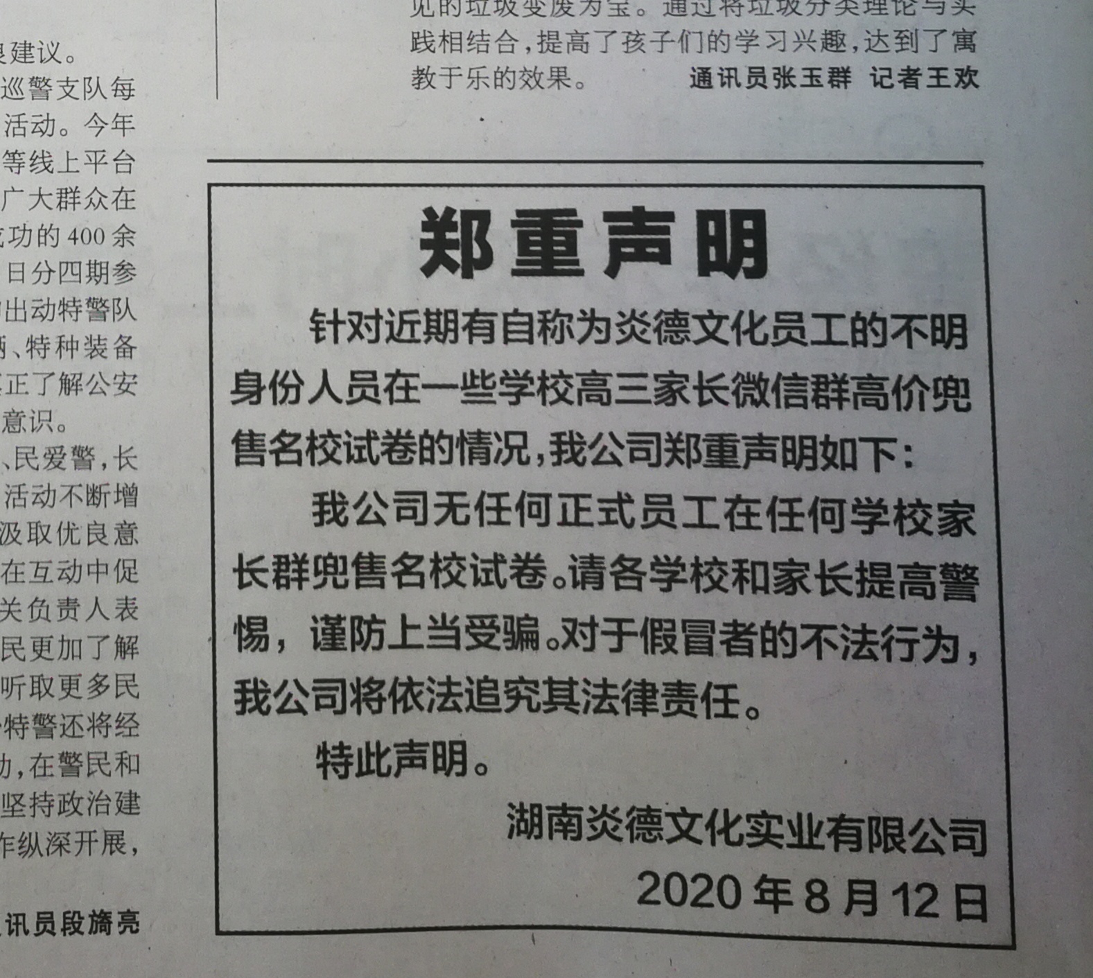 針對近期有自稱為炎德文化員工的不明身份人員在一些學校高三家長微信群高價兜售名校試卷的情況,我公司鄭重聲明如下: