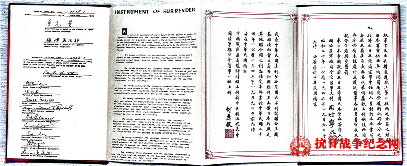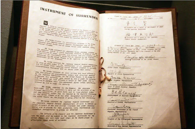 1945年8月15日,裕仁天皇向全國進行廣播接受《波茨坦公告》并且頒布無條件投降詔書,宣布向盟國無條件投降。盟軍最高司令麥克亞瑟隨即率美、中、英、蘇、澳、加、法、荷、新等國的代表赴日本受降。簽字儀式于1945年9月2日上午九時在美國海軍“密蘇里”號戰(zhàn)列艦上舉行。中國代表徐永昌上將在商震將軍陪同下代表中國在投降書上簽字。