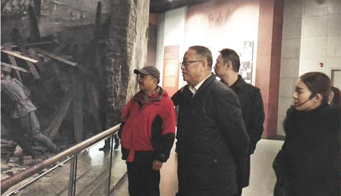 湖南炎德文化實業(yè)有限公司董事長何譽軍(左一)陪同十四屆全國人大常委會副委員長,民革中央主席鄭建邦(左二)參觀湖南抗戰(zhàn)紀念館。