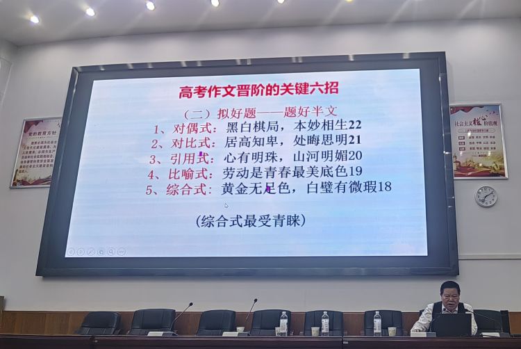 本次講座主題是高考作文提升的關(guān)鍵六招及備考策略,圍繞“審好題、擬好題、建好構(gòu)、用好例、寫深刻、語言優(yōu)”六個關(guān)鍵點展開。馬老師語言風趣幽默、 舉止平易近人,講座內(nèi)容涉及知識面之廣,提供信息之前沿,傳遞消息之權(quán)威,可謂傾囊相助,盡顯其深厚的專業(yè)功底和高雅的文學涵養(yǎng)。