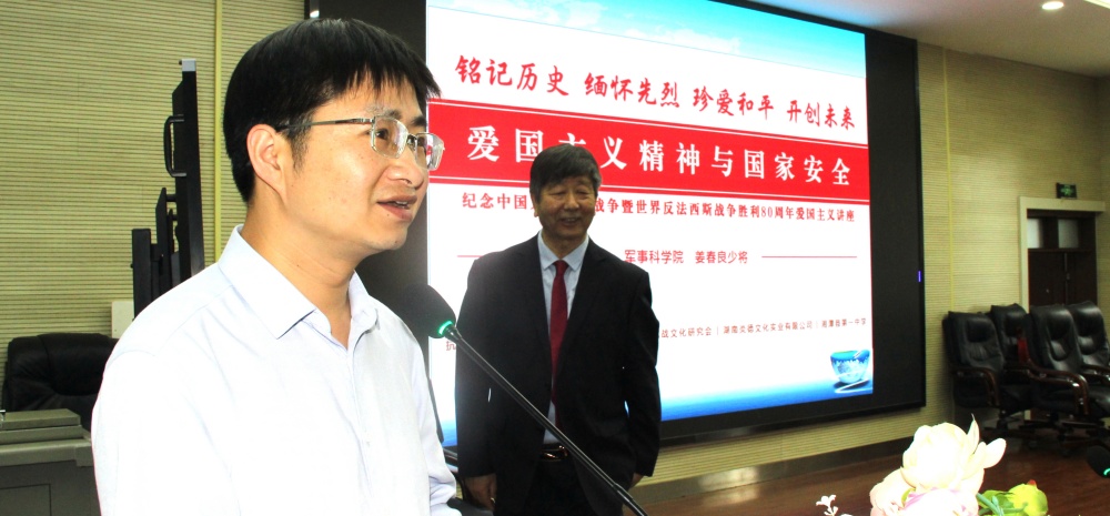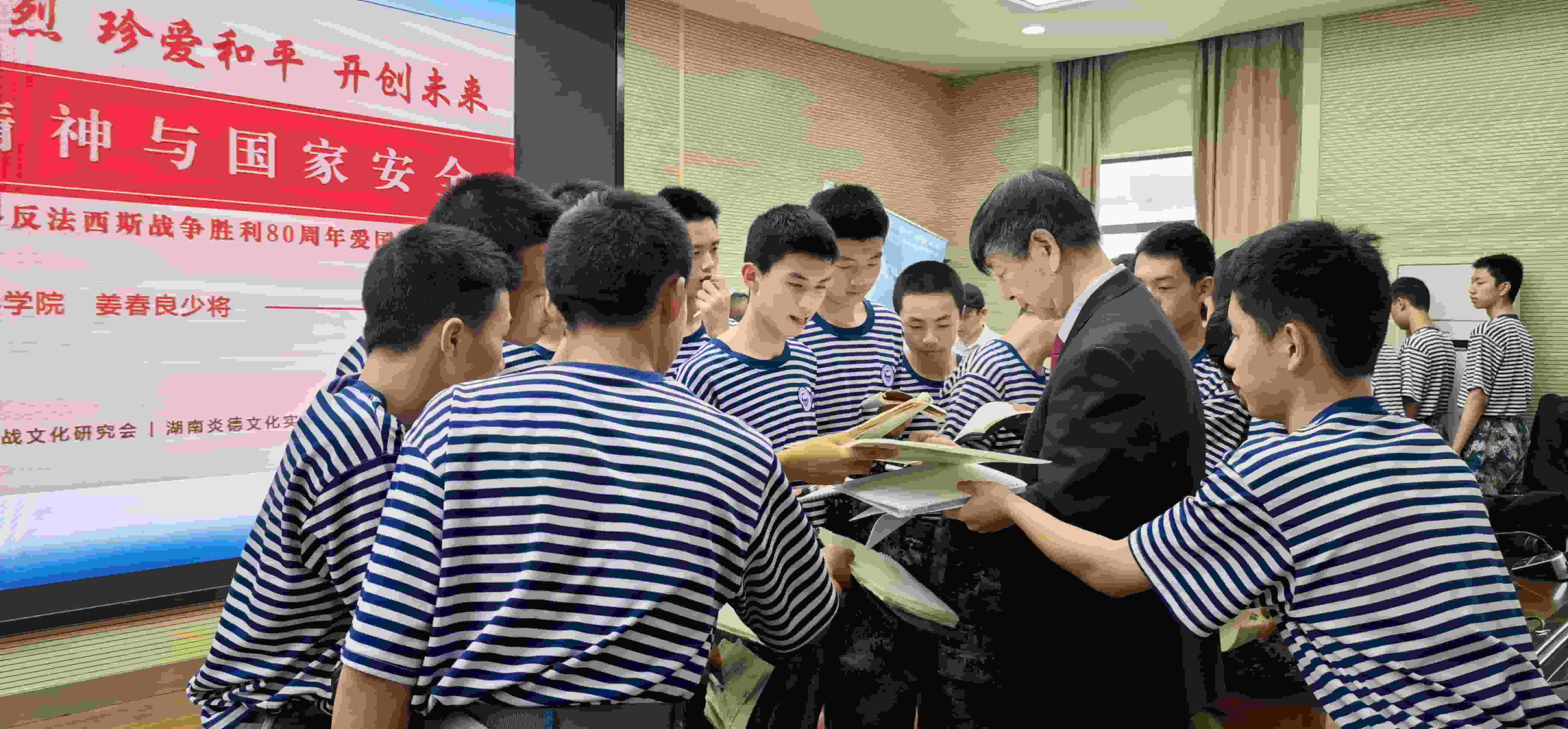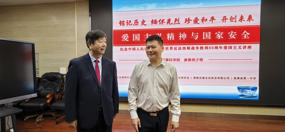為紀(jì)念中國人民抗日戰(zhàn)爭(zhēng)暨世界反法西斯戰(zhàn)爭(zhēng)勝利80周年,弘揚(yáng)偉大抗戰(zhàn)精神,深化青少年愛國主義教育,湖南炎德文化實(shí)業(yè)有限公司、抗日戰(zhàn)爭(zhēng)紀(jì)念網(wǎng)、抗日戰(zhàn)爭(zhēng)圖書館、長(zhǎng)沙市抗戰(zhàn)文化研究會(huì)決定聯(lián)合主辦“銘記歷史 緬懷先烈 珍愛和平 開創(chuàng)未來”愛國主義教育講座,邀請(qǐng)中國人民解放軍軍事科學(xué)研究院研究員姜春良少將主講《愛國主義和國家安全》。