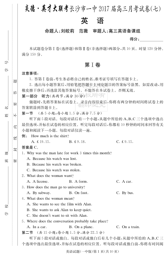 【英語】炎德英才大聯(lián)考2017長沙一中高三7次月考