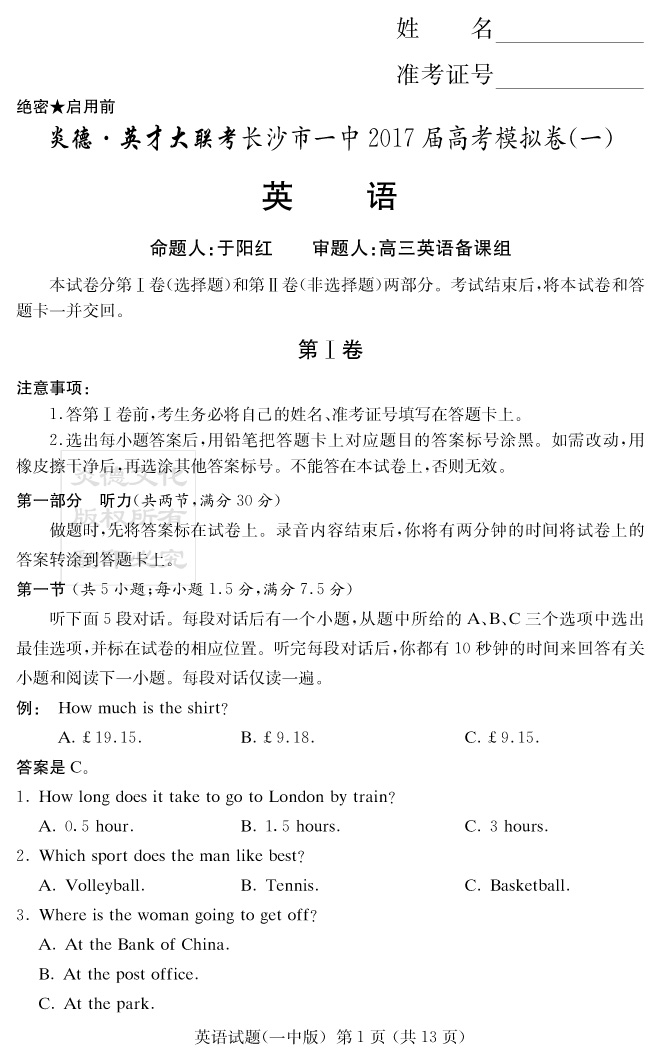 【英語】炎德英才大聯(lián)考2017長沙一中高三10次月考(模擬一)
