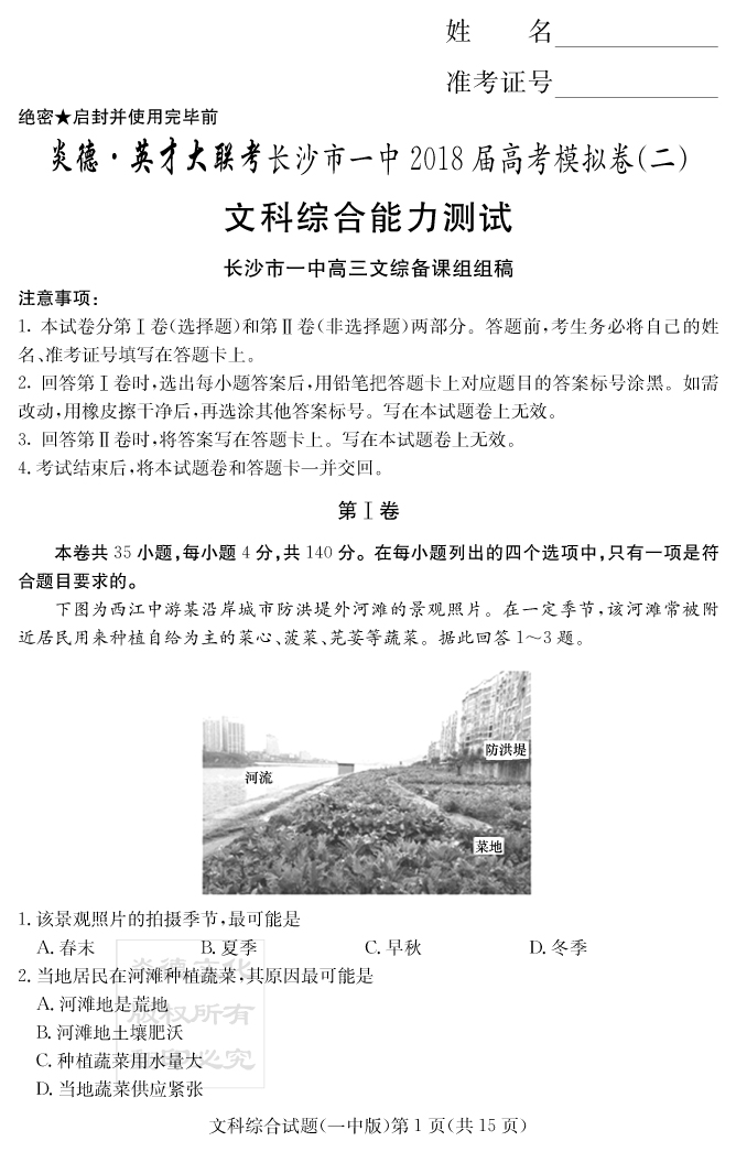 【文綜】炎德英才大聯(lián)考2018長沙一中高三11次月考(模擬二)